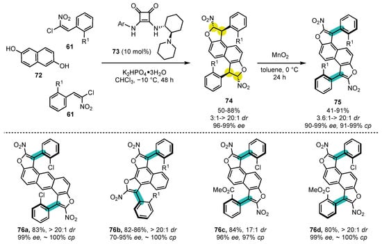 In 2017, Bonne and Rodriguez reported the first enantioselective synthesis of two series of arylfuran atropisomers (Scheme 17) [132]. Using α-chloronitroolefins 61 as Michael acceptors in combination with cyclic diketones or β-naphthols in the presence of squaramide catalyst 62, two families of dihydrofurans 63 and 65 could be prepared. The reaction consists of an enantioselective Michael addition followed by nucleophilic displacement of the chloride by the oxygen atom. The first family of furan atropisomers 64 was obtained using hypervalent iodine as the oxidant in basic media. For the second family, the best condition for the oxidation of this type of substrate to obtain furan atropisomers 66 was the use of MnO2 in toluene.