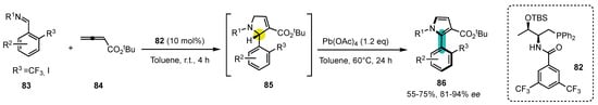 - Xiang Alvin Tan, C.; Li, R.; Zhang, F.; Dai, L.; Ullah, N.; Lu, Y. Synthesis of Axially Chiral CF3-Substituted 2-Arylpyrroles by Sequential Phosphine-Catalyzed Asymmetric [3+2] Annulation and Oxidative Central-to-Axial Chirality Transfer. Angew. Chem. Int. Ed. 2022, 61, e202209494. [Google Scholar] [CrossRef] [PubMed]