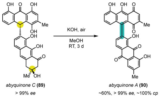 - Konkol, L.C.; Guo, F.; Sarjeant, A.A.; Thomson, R.J. Enantioselective Total Synthesis and Studies into the Configurational Stability of Bismurrayaquinone A. Angew. Chem. Int. Ed. 2011, 50, 9931–9934. [Google Scholar] [CrossRef]