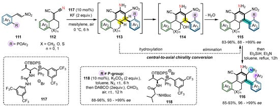 - Zhu, L.; Peng, H.; Guo, Y.; Che, J.; Wu, J.-H.; Su, Z.; Wang, T. Enantioselective Synthesis of Atropisomeric Biaryl Phosphorus Compounds by Chiral-Phosphonium-Salt-Enabled Cascade Arene Formation. Angew. Chem. Int. Ed. 2022, 61, e202202467. [Google Scholar] [CrossRef]