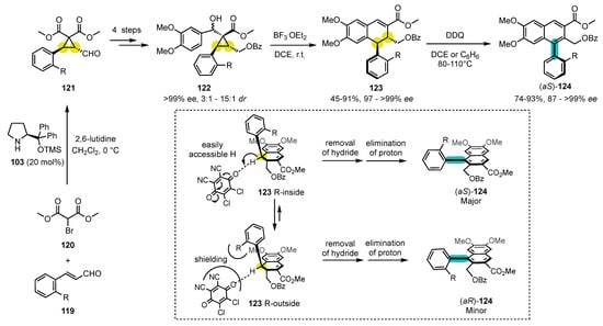 - Saito, T.; Shimizu, Y.; Araki, Y.; Ohgami, Y.; Kitazawa, Y.; Nishii, Y. From Enantioenriched Donor-Acceptor Cyclopropylcarbinols to Axially Chiral Arylnaphthalenes through Aryldihydronaphthalenes: Central-to-Axial Chirality Exchange. Eur. J. Org. Chem. 2022, 2022, e202101213. [Google Scholar] [CrossRef]