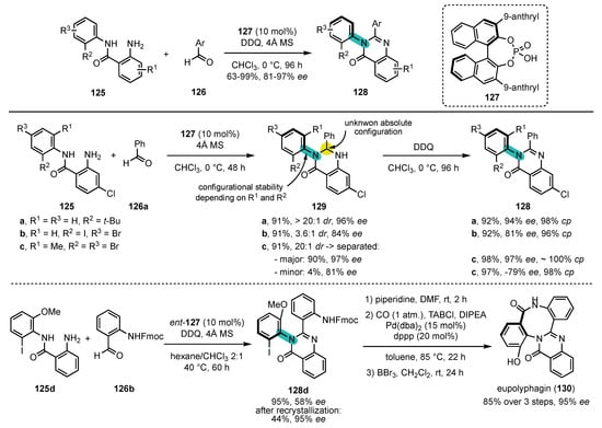 - Wang, Y.-B.; Zheng, S.-C.; Hu, Y.-M.; Tan, B. Brønsted acid-catalysed enantioselective construction of axially chiral arylquinazolinones. Nat. Commun. 2017, 8, 15489. [Google Scholar] [CrossRef] [PubMed]
