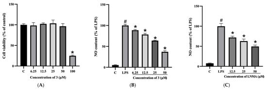 NO has been identified as a pro-inflammatory molecule and is associated with chronic inflammatory diseases and cancers [26,27]. NO production is generally regarded as a marker of macrophage activation, which is closely related to the pathogenesis of inflammatory diseases [28]. In the following study, we first tested whether 3 can affect the NO production of RAW264.7 cells. As shown in Figure 2B, compound 3 significantly suppressed LPS-induced NO production in a dose-dependent way. NO contents were 49.49, 43.70, 35.48, and 20.45 µM when treated with 6.25, 12.5, 25.0, and 50.0 µM of compound 3, respectively.