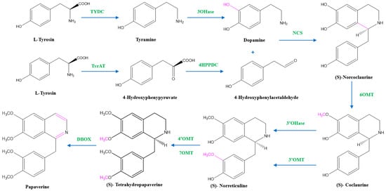 The first step in papaverine biosynthesis is the condensation of two L-tyrosine derivatives, 4-hydroxyphenylacetaldehyde (4HPAA) and dopamine, which is accomplished through decarboxylation, meta-hydroxylation, and transamination to produce the precursor to all other benzylisoquinoline alkaloids, (S)-norcoclaurine. Tyrosine decarboxylase (TYDC) and tyramine 3-hydroxylase (3OHase) transform L-tyrosine into tyramine and dopamine, respectively. L-tyrosine can be transaminated by L-tyrosine aminotransferase (TyrAT) in the production of 4HPAA, and then decarboxylated by an enzyme identified as 4-hydroxyphenylpyruvate decarboxylase (4HPPDC). Norcoclaurine synthase (NCS) is the enzyme that catalyzes the condensation of (S)-norcoclaurine from 4HPAA and dopamine.