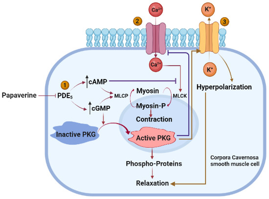 PDE5 inhibitors are used as the first-line therapy for ED [32]. As a popular vasodilator, their usage has been observed to improve penile impotence [33]. Its ability to treat ED and impotence has been known for a long time. By far, the largest number of studies have been published demonstrating the effectiveness of papaverine in treating erectile dysfunction (ED) and impotence [34]. Three simultaneous and synergistic processes work together to maintain normal erectile function: (1) relaxation of the cavernosal smooth muscle, (2) an increase in penile arterial inflow caused by neurological activity, and (3) a restriction of venous outflow from the penis. These processes occur due to the following: (1) the activation of cGMP-dependent protein kinase G (PKG); (2) the activation of cGMP-dependent ion channels that reduce intracellular Ca2+ by Ca2+ sequestration and/or extrusion; (3) the opening of K+ channels, causing the hyperpolarization of corpus cavernosum smooth muscle cells; and (4) the activation of myosin light-chain phosphatases. The objective of ED pharmacotherapy is to develop novel pharmacological targets that inhibit the contractile systems (α-adrenoceptor antagonists) and activate (e.g., prostaglandin E1 (PGE1), NO-donors, and forskolin) or augment (e.g., PDE inhibitors and gene therapy) the vasodilatory systems to produce greater trabecular smooth muscle relaxation of the corpora cavernosa [35,36,37] (Figure 6).
