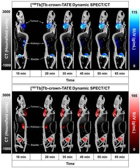 Preclinical SPECT/CT studies were undertaken to evaluate the potential of [155Tb]Tb-crown-TATE and [161Tb]Tb-crown-TATE for imaging pancreatic exocrine tumours. The 155Tb/161Tb-labelled radiotracers were each administered to male NRG mice bearing AR42J tumour xenografts (left-shoulder) and a series of dynamic quantitative SPECT/CT scans were acquired from 0 to 2.5 h post-administration, Figure 3 and Figure 4. From the quantitative SPECT/CT scans, mean standardised uptake values (SUVmean) were extracted for regions of interest (ROIs) in tumour, kidneys, and bladder. The quantitative imaging studies enabled direct measurement of the activity concentrations (%ID/g) in ROIs in the SPECT/CT scans over time which can be compared to the ex vivo biodistribution results obtained after euthanising the mice following acquisition of the final SPECT/CT scan (2.5 h p.i.). Full biodistribution results for the imaging studies are provided in the Supplementary Materials, Figure S3 and Table S1.