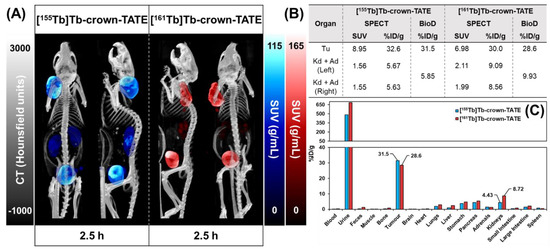 For biodistribution studies, experiments were performed using four replicates (n = 4) for each unblocked group and three replicates (n = 3) in the blocked groups. [155Tb]Tb-crown-TATE (~175 kBq, 93 pmol, 100 μL) or [161Tb]Tb-crown-TATE (~850 kBq, 76 pmol, 100 μL) was administered intravenously via the lateral tail using a Tailveiner restrainer. After administration, mice were allowed to roam freely in their cages. Biodistribution studies were performed at 2 h post-administration of [155Tb]Tb-crown-TATE or [161Tb]Tb-crown-TATE. Mice were euthanised by CO2 asphyxiation under 2% isoflurane anaesthesia, followed by cardiac puncture to recover activity in the blood pool. Organs of interest were completely harvested, weighed, and the activity measured using a gamma counter (Packard Cobra II, Perkin Elmer, Waltham, MA, USA). To account for organs that could not be fully extracted (such as blood, muscle, and bone), standardised organ weights for age- and sex-matched mice were used to correct the data [35,36]. The results are reported as the percentage of the injected dose per gram (%ID/g) and per organ (%ID/organ).