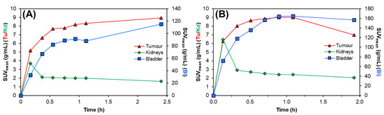 Both radiotracers showed fast clearance from the bloodstream, with rapid elimination through the renal pathway, as evidenced by activity in the kidneys and bladder, giving high contrast images. This is further supported by the time–activity curves, Figure 5, where most of each radiotracer was cleared from circulation and tumour uptake reached a plateau within 0.5 h p.i., as shown in Table 1. Comparatively, the preclinical SPECT studies with 155Tb yielded superior imaging quality over 161Tb, with higher image contrast and lower signal noise. However, these studies clearly show the suitability of 161Tb for performing dosimetry and patient monitoring studies following administration of 161Tb therapy treatments, as is standard practice for 177Lu therapies.
