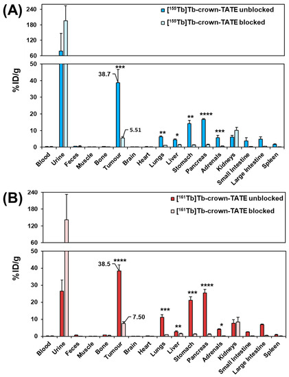 Biodistribution results in male NRG mice bearing AR42J tumours at 2 h post-administration of the following: (A) [155Tb]Tb-crown-TATE (~175 kBq, 93 pmol/animal) (n = 4) (unblocked) and [155Tb]Tb-crown-TATE (~175 kBq, 93 pmol/animal) (blocked with DOTATOC (23 nmol/animal)) (n = 3); (B) [161Tb]Tb-crown-TATE (~850 kBq, 76 pmol/animal) (unblocked) (n = 4) and [161Tb]Tb-crown-TATE (~850 kBq, 76 pmol) (blocked with DOTATOC (23 nmol/animal) (n = 3). (* = p < 0.05, ** = p < 0.01, *** = p < 0.001, **** = p < 0.0001).
