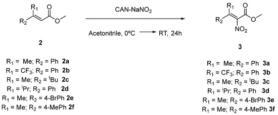 Acrylates 2a, 2b, 2c, 2d, 2e and 2f (5.68 mmol) were dissolved in 50 mL of acetonitrile and cooled to 0 °C. Then, sodium nitrite (17 mmol) and cerium ammonium nitrate (17 mmol) were added at the same temperature, and the reaction mixture was allowed to warm to room temperature and stirred for 24 h. After this time, the reaction was filtered through a pad of celite, and the filtrate was concentrated under reduced pressure. The residue was poured into cold water and extracted with DCM (3 × 50 mL). The combined organic layers were dried using MgSO4, filtered and concentrated in vacuo. The crude product was purified by column chromatography using an appropriate mixture of solvents to afford nitroacrylates. For further details see the Supporting Information.
