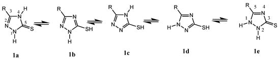 The concept of tautomerization is called tautomerism, which results in the formal migration of a hydrogen atom or proton, accompanied by a switch of a single bond and its adjacent double bond. Therefore, 1,2,4-triazole thione presents five tautomeric forms—wo tautomers of type thione 1a,1e and 3 tautomers of type thiol 1b–d (Figure 1). Thus, 1,2,4-triazole thione derivatives are characterized by nucleophilic and electrophilic reactions and regarded as versatile synthetic intermediates for the preparation of several biologically active N-bridged and S-bridged heterocyclic compounds [25].