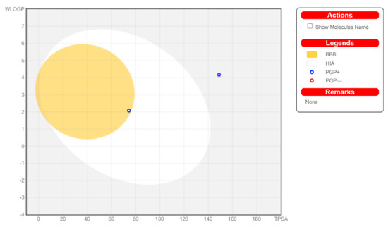 The calculated physicochemical properties, lipophilicity, water solubility, pharmacokinetics, drug-likeness, and medicinal chemistry properties of 3 and 4 are provided in the Supplementary Materials (Tables S1–S5). The drug-like properties reveal that 3 obeyed Lipinski’s rule of five, with molar mass less than 500 g-mol−1, and lipophilicity (MlogP) less than 1.55 (Tables S2 and S5), while for 4, no drug-like property was validated, as these rules were violated (Table S5). For 3, the calculated topological surface area (TPSA) was 74.5 Ų, which was in the range of 78–125 Ų (Table S1), indicating moderate oral absorption with a good bioavailability score of 0.55 (Table S1 and Table S5). The bioavailability was visualized using the bioavailability radars (Figure 10), with all the properties of 3 inside the pink area of the polygon, which suggested that 3 may have good oral bioavailability. The pharmacokinetics properties showed that 3 had high GI absorption (Table S4) and may have penetrated the blood–brain barrier (BBB) (Figure 11), but had low skin permeability with log Kp > −2.5 (Table S4). To estimate the biological targets and the possible side effects of 3 and 4, their corresponding pie-charts were predicted (Figure 12), which showed that 3 may act as an inhibitor of DNA-dependent protein kinase (DNA-PK).