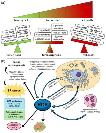 (a) Effect of ROS level on cells. Reproduced with permission [18]. Copyright 2018, Elsevier Ltd. (b) ROS−induced damage to the cells. The arrows indicate the sources of ROS and their effects on cells. Reproduced with permission [19]. Copyright 2019, MDPI (Basel, Switzerland). Healthy cells can keep adequate adaptations to overcome the damaging effects of ROS. Elevated ROS levels at toxic concentrations can generate oxidative stress, resulting in irreparable damage to the cell, inadequate adaptations and eventually tumor cell death.