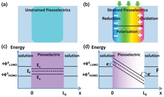 In general, piezoelectric materials are mainly composed of noncentrosymmetric crystals. This structural asymmetry originates from the anisotropic arrangement of oppositely charged ions in the materials. Under the action of applied stress, the atoms are displaced from their original lattice position, resulting in a net electrical charge over the whole crystal, which can be uniformly oriented in a microdomain with a mutual counterbalance of the corresponding charges. The electric dipoles in the domain can be aligned by exerting a mechanical stress to the material, which results in a separation/redistribution of the oppositely charged ions to the two sides of the material, eventually forming a built−in electric field and inducing band bending of the semiconductor [20], as presented in Figure 2. When the surface charges actively promote or obstruct the electrochemical reactions, taking place at the interface between the material and the solution, this is referred to as piezoelectric catalysis or piezocatalysis [21,22].