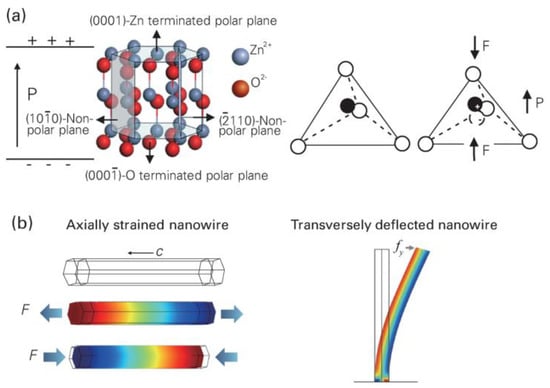 (a) Atomic model of the wurtzite−structured ZnO. (b) Finite element analysis simulated piezoelectric potential distribution in a ZnO nanowire. Three−dimensional graphs of the nanowire piezoelectric potential distribution and deformation shape at 85 nN of stretching force (middle) and 85 nN of compressing force (bottom). Reproduced with permission [30]. Copyright 2018, IOP Publishing.
