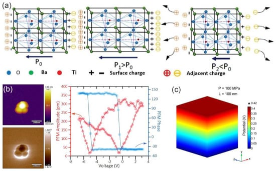 (a) Schematic illustration of charge migration within BTO unit cell with variations in stress. Reproduced with permission [36]. Copyright 2015, American Chemical Society. (b) Topographic image and corresponding phase hysteresis and amplitude butterfly loops of a BTO nanocube measured using PFM. (c) Finite element analysis of the electric field of BTO nanocubes at pressure of 100 MPa. Reproduced with permission [37]. Copyright 2022, American Chemical Society.