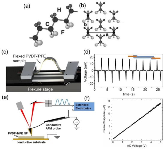 (a) Chain structure PVDF in the all−trans conformations, which exhibits the planar carbon backbone with coupled F and H atoms, and (b) the crystal structure of the phase. In this figure, a and b represent the parallel alignment of the junction axes and the direction of polarization, respectively. Reproduced with permission [43]. Copyright 2023, Royal Society of Chemistry. (c) Piezoelectric characterization of the electro−spun nanofibers. (d) Flexure test experiment. Plot depicts the generated voltage for a number of flexed and unflexed states; inset shows a schematic of the ready sample. (e) PFM experimental schematic of PVDF−TrFE nanofiber and (f) its piezo−response amplitude vs. applied voltage. Reproduced with permission [44]. Copyright 2015, American Chemical Society.
