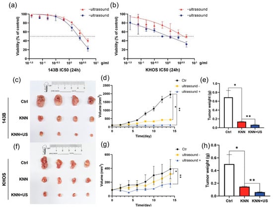 (a,b) 143B and KHOS cell viability in the presence of KNN with and without ultrasonication. (c) Photo images of the tumors from 143B cell xenografts under different treatments. (d,e) 143 B cell xenograft tumor growth (n = 4, * p < 0.05, ** p < 0.01). (f) Images of tumors created using KHOS cells from the xenografts of different treatments. (g,h) KHOS cell xenograft tumor growth. Reproduced with permission (n = 4, * p < 0.05, ** p < 0.01) [53]. Copyright 2022, Wiley−VCH.