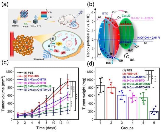 (a) Schematic diagram of •OH and •O2− generated on T−BTO under ultrasonic conditions. (b) Energy band bending under ultrasonication. (c) Schematic diagram of piezoelectric therapy for tumor. (d) Tumor treatment results under different conditions. Reproduced with permission [38]. Copyright 2020, Wiley−VCH.