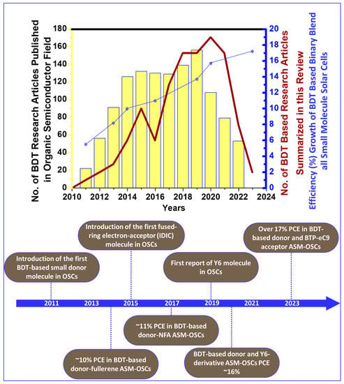 The number of BDT research articles published in the organic semiconductor field (through the keyword “benzo[1,2-b:4,5-b′]dithiophene (BDT)” on Web of Science) and a brief timeline of the development of BDT donor-based ASM OSCs.