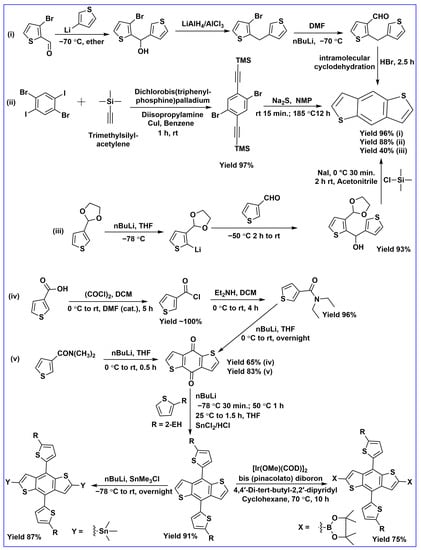 In the early 1980s, BDT-based molecules were synthesized and reported for their electrical conducting properties []. Subsequently, several organic molecules with BDT units were prepared and applied in organic field-effect transistors (OFETs). Over the years, several synthetic routes were developed in various studies, as shown in Figure 2. Benzannulation engages the construction of BDT from the condensation of two thiophene rings after dehydrative cycloaromatization (Bradsher-type reaction) []. The thienannulation reaction shows a more innovative way to construct BDT. More recently, BDT units have been constructed by 3-thiophenecarboxaldehyde (Figure 2) []. As shown in Figure 2, the intermediate benzo[1,2-b:4,5- b′]dithiophene-4,8-dione played an important role in the synthesis of a BDT unit with various lateral substitutions to tune the properties of BDT-based molecules. Since Suzuki or Stille coupling are the two most popular reactions involved in the preparation of conjugated BDT organic electronic materials, boronic acid esters or stannane compounds are needed for the reactions with n-butyllithium and then addition of chloro trimethyl stannane or 2 isopropoxy-4,4,5,5-tetramethyl-1,3,2 dioxaborolane [].