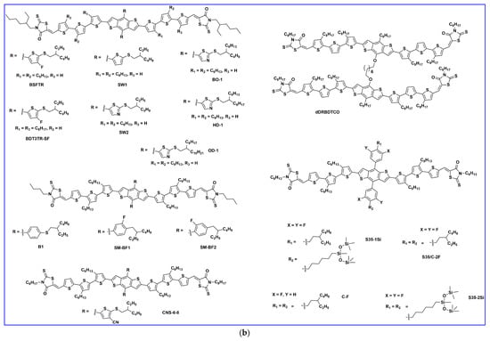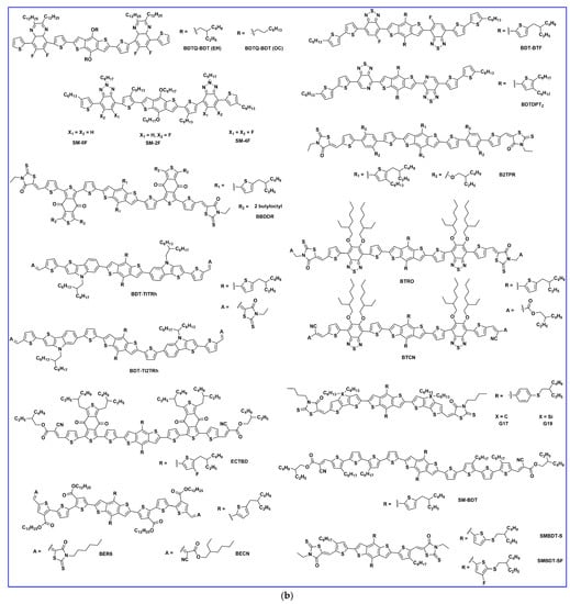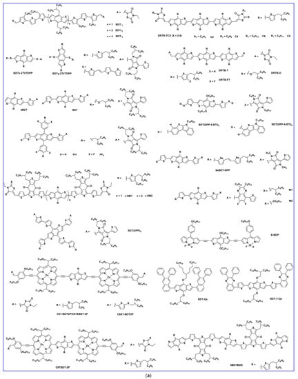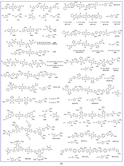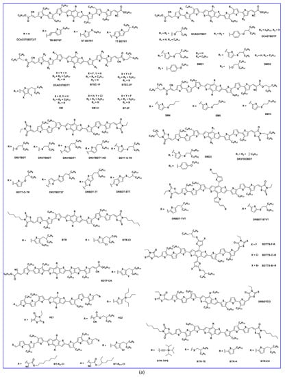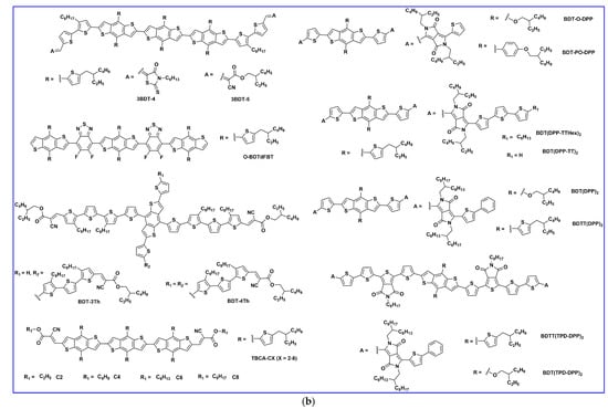 (a) BDT molecular structures with various combinations. (b) BDT molecular structures with various combinations.