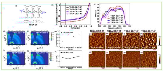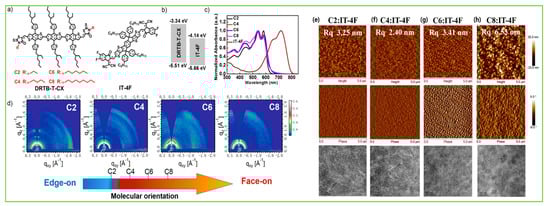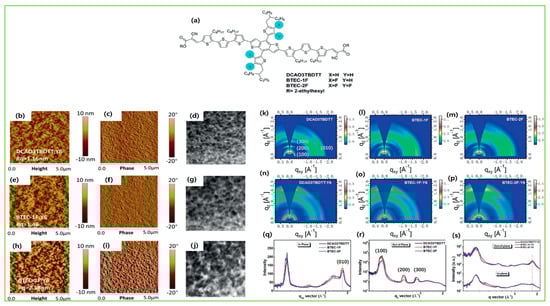 Here, we attempt to convey more specific information about the subtle modification in chemical structures and their impacts on morphology. The first example is DCAO3TBDTT and its analogous molecules, BTEC-1F and BTEC-2F with Y6 acceptor []. The atomic force microscopy (AFM) images showed that the surface roughness increased from DCAO3TBDTT: Y6 (1.16 nm) to BTEC-1F: Y6 (1.46 nm) and BTEC-2F: Y6 (2.58 nm). The same trend was also observed in transmission electron microscopy (TEM) results; the phase images of BTEC-2F: Y6 film exhibited a remarkably coarser and bigger domain size and thus implied a suitable interpenetrating network, exciton dissociation, and charge transport. The grazing-incidence wide-angle X-ray scattering (GIWAXS) result showed that the DCAO3TBDTT and BTEC-1F had the same π-π stacking, while BTEC-2F exhibited more compact π-π stacking distance due to its better planarity and so increased the hole transport behavior, resulting in increases in the fill factor and efficiency (Figure 8b–s). The 2D GIWAXS images for the SM4:BO-4Cl, SM8:BO-4Cl, and SM12:BO-4Cl blend films were utilized to observe the morphology and crystallization. The SM4:BO-4Cl distributed quite a few scattering points, showing that it has high crystallinity and easily forms coarser phase domains, while the SM8:BO-4Cl- and SM12:BO-4Cl-blend films tended to have face-on orientation, indicating the charge transfer in the vertical direction across the active layer. The closest crystal coherence lengths (CCLs) of the π−π stacking and ordered crystal structure was observed based on the SM8:BO-4Cl blend film, benefitted in charge transfer and inhibited molecular recombination, and thus resulted in the best FF and PCE amongst the SM4:BO-4Cl- and SM12:BO-4Cl-blend films (Figure 9a–c) []. Replacing the hexyl side chains in the thienyl lateral side group of BTR with chlorine atoms, the BTR-Cl retained the liquid crystalline property with high crystallinity and the device with Y6 acceptor formed a more textured surface, with wrinkle-like microstructures, and a well-balanced phase separation and optimal film morphology were obtained and yielded a higher efficiency of 13.67% compared with the control device, BTR (10.67%) (Figure 10A–H) []. With further device optimization, Tang et al. demonstrated that concentration-induced delicate fine-tuning of the morphological strategy of BTR-Cl:Y6 exhibited an efficient PCE of 14.7% (Figure 10a–i) [].