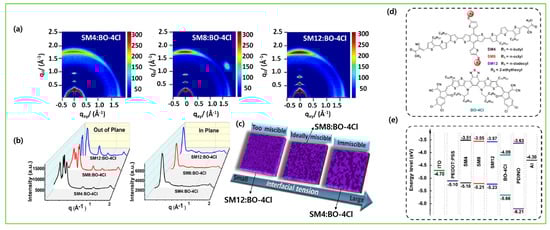 (a) Two-dimensional diffraction patterns of the blend films of SM4:BO−4Cl, SM8:BO−4Cl, and SM12:BO−4Cl. (b) One-dimensional diffraction profiles in the in-plane and out-of-plane directions for blend films. (c) Pictorial illustration of the influence of interfacial tensions on the miscibility. (d) Chemical structures of SM4, SM8, SM12, and BO−4Cl. (e) Energy levels of all materials used in []. Adapted with permission from []. Copyright 2021, American Chemical Society.