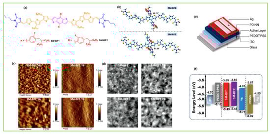 (a) Chemical structures of the SMDs SM−BF1 and SM−BF2. (b) Optimized molecular structures of the SMDs obtained from the DFT-based theoretical calculations. (c) AFM height images and phase images of the SM-BF1:Y6 and SM−BF2:Y6-blend films. (d) TEM images of the SM−BF1 and SM−BF2 neat films and the SM−BF1:Y6 and SM−BF2:Y6 blend films. (e) Device structure and (f) energy level diagram of the related materials used in the SM-OSCs. Adapted with permission from []. Copyright 2021, John Wiley and Sons.