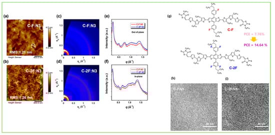 (a,b) AFM height images of C-F:N3 and C-2F:N3 blend films. (c,d) GIWAXS two-dimensional diffraction patterns of C-F:N3 and C-2F:N3. (e,f) In-plane and out-of-plane line-cut profiles of the two-dimensional GIWAXS data of C-F:N3 and C-2F:N3 blend films. (g) Chemical structures of C-F and C-2F. (h,i) TEM images of C-F: N3 and C-2F: N3 blend films, respectively. Adapted with permission from []. Copyright 2022, American Chemical Society.