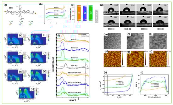 (a) Chemical structure of small-molecular donors. (b) Cyclic voltammograms (CV). (c) Energy level of the related donor and acceptor materials used in the SM-OSCs. (d) Contact angles of water and ethanediol droplets on BSCl-C1, BSCl-C2, and BSCl-C3 and IDIC-4Cl pristine films. (e–h) Two-dimensional GIWAXS patterns of donors BSCl-C1, BSCl-C2, and BSCl-C3 and acceptor IDIC-4Cl pure films. (i–k) Two-dimensional GIWAXS patterns of blended films under optimized conditions and (l) one-dimensional GIWAXS curves of BSCl-C1, BSCl-C2, BSCl-C3, and IDIC-4Cl pure and blended films under optimized conditions. (m–o) TEM images of blended films based on different donors BSCl-C1, BSCl-C2, and BSCl-C3 and (p–r) corresponding AFM height images. (s) Optimized J-V curves for the three systems and (t) EQE spectra of the corresponding devices. Adapted with permission from []. Copyright 2020, American Chemical Society.