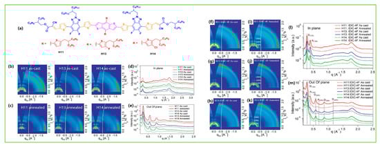 (a) Chemical structure of H11, H13, and H14 donors. (b,c) Two-dimensional GIWAXS patterns without and with thermal annealing. (d,e) In-plane and out-of-plane 1D line cuts of the neat donor films without and with thermal annealing. (f–k) Two-dimensional GIWAXS patterns. (l,m) In-plane and out-of-plane scattering profiles of the blend films without and with thermal annealing. Adapted with permission from []. Copyright 2020, John Wiley and Sons.