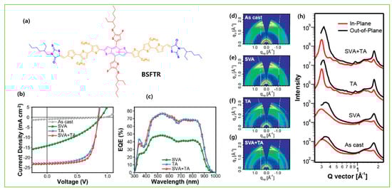 (a) Chemical structure of BSFTR donor. (b,c) J-V and EQE curves for SMSCs based on BSFTR and Y6 with different post-treatments under AM 1.5 G irradiation. (d–g) Two-dimensional GIWAXS patterns and (h) out-of-plane and in-plane scattering profiles of the blend films without and with post-treatments. Adapted with permission from []. Copyright 2019, John Wiley and Sons.