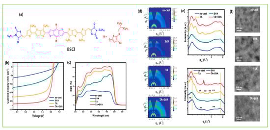 (a) Chemical structure of BSCl donor. (b,c) J-V and EQE curves for SMSCs based on BSCl:IDIC-4Cl blend films with different post-treatments under AM 1.5 G irradiation. (d) Two-dimensional GIWAXS graphs with different post-treatment. (e) Corresponding curves of 2D GIWAXS patterns and (f) TEM images. Adapted with permission from []. Copyright 2020, Royal Society of Chemistry.