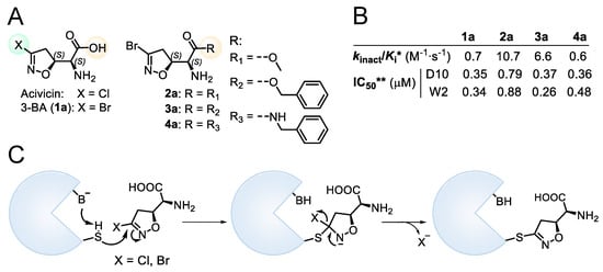 (A) Chemical structure of acivicin, 3-BA (1a) and 3-BA derivatives (2a–4a). (B) Biological data for compounds 1a–4a. * Second-order rate constant used to characterize covalent binding of irreversible inhibitors to PfGAPDH. ** IC50 towards P. falciparum D10 and W2 strains. (C) Proposed reaction mechanism for the 3-halo-4,5-dihydroisoxazole moiety.