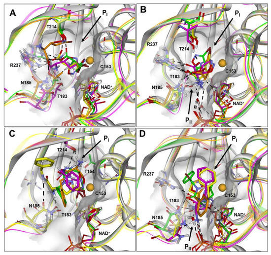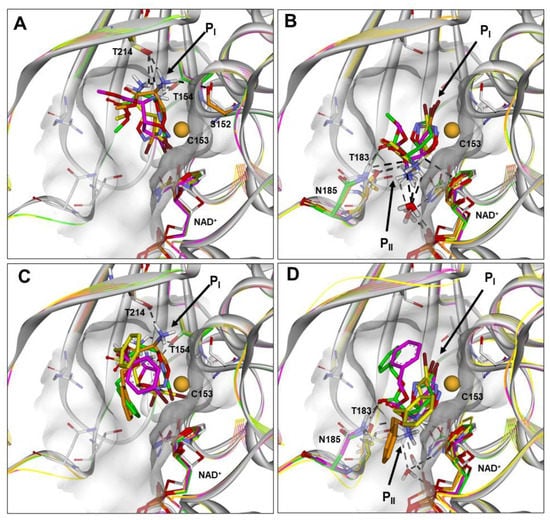 For each compound, the resulting complexes were superimposed on the starting structure by fitting all the Cα atoms, and the Cα RMSD of each residue and its average value were calculated. Then, the complexes were again superimposed on the starting structure by fitting the Cα atoms of the residues characterized by an average value of RMSD ≤ 0.2 Å. Considering this latter superimposition, the Cα RMSD of the catalytic residues and the RMSD of NAD+ were calculated. The χ1 torsion angle of C153 and the geometric criteria of the hydrogen bond between C153 and H180 were also evaluated for each generated complex. In particular, the angle D-H-A and X-D-A of this hydrogen bond was calculated, assuming as D the sulfur atom of C153, as A the Nτ hydrogen atom of H180, and as X the Cβ of C153.