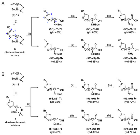 The synthesis of the enantiomerically pure target compounds started by using the chiral synthons (S)-12 or (R)-12. The diastereoisomeric mixtures 5 and 6 were obtained through the 1,3-dipolar cycloaddition of bromonitrile oxide to alkenes (S)-12 and (R)-12, respectively, as previously described [19]. Treatment of 5 with a 5:1 mixture of AcOH/H2O provided alcohols 7a and 7b (Scheme 1A) that were separated by flash chromatography. Analog conditions led to the synthesis of alcohols 7c and 7d, starting from 6 (Scheme 1B). Alcohols 7a–d were oxidized to the corresponding carboxylic acids 8a–d using Fe(NO3)3·9H2O, TEMPO, and KCl under an air flux as an O2 source [20]. This is a cleaner method compared to the traditional oxidation procedures used to convert alcohols into carboxylic acids, which typically involve the use of chromium-based reagents, and it allowed us to obtain the desired products in high yields (80–88%). The final amino acids 1a–d were obtained after treatment of the N-Boc precursors (8a–d) with a 15% TFA solution in dichloromethane. The zwitterionic compounds were isolated after ion-exchange chromatography employing the DOWEX Marathon C (H+ form) resin.