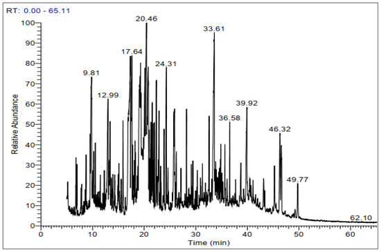 Representative GC-MS chromatogram of derivatized methanolic extract of C. mixtus leaves.
