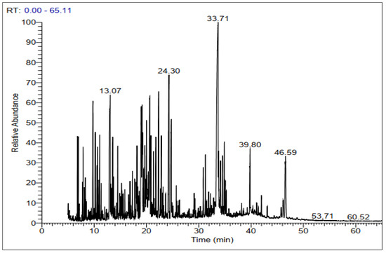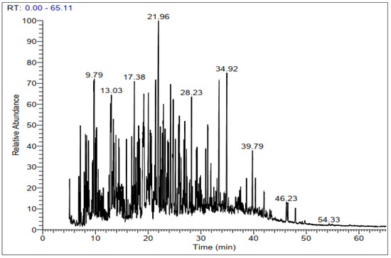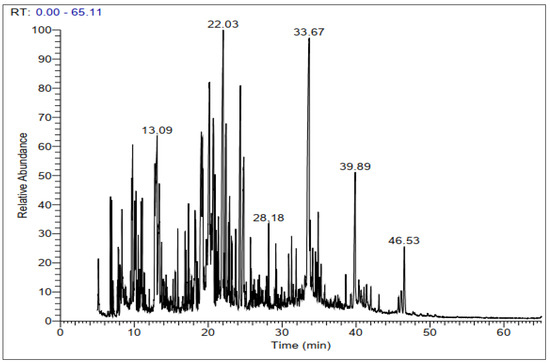 GC-MS chromatograms of derivatized extracts from flowers, leaves, stems, and roots of C. mixtus at different retention times (Figure 1, Figure 2, Figure 3 and Figure 4) revealed the presence of 42, 74, 70, and 83 phytochemical compounds, respectively. These compounds can be mainly divided into six groups, including carbohydrates, lactones, organic acids, fatty acids, phenols, amino acids, and other biomolecule groups. In general, the extracts from flowers, leaves, stems, and roots were dominated by sugars (27.25, 54.8, 64.87, and 62.57%, respectively) (Table 2). Sucrose was observed to be the main biomolecule detected in roots (22.47%), flowers (17.01%), and stems (14.84%), while myo-inositol was the major compound identified in leaves (9.38%).