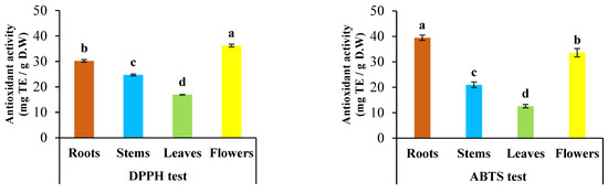 Antioxidant activity of different organ extracts of Cladanthus mixtus by the DPPH and ABTS tests. Different letters indicate significant differences between the organs of one plant at p < 0.05. Values are means ± S.D. for three replicates.