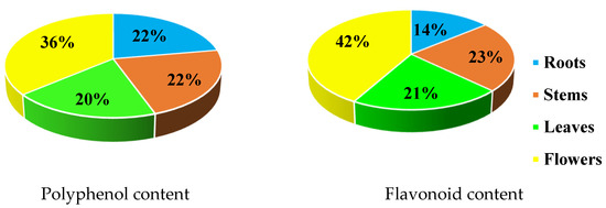 Methanolic extracts of C. mixtus flowers showed the highest content of polyphenols (36%), followed by flavonoids (42%) (Figure 6). Polyphenol contents were similar in roots and stems (22%), followed by leaves (20%). For flavonoids, the stems showed a content close to that of the leaves (23% and 21%, respectively), followed by the roots (14%).