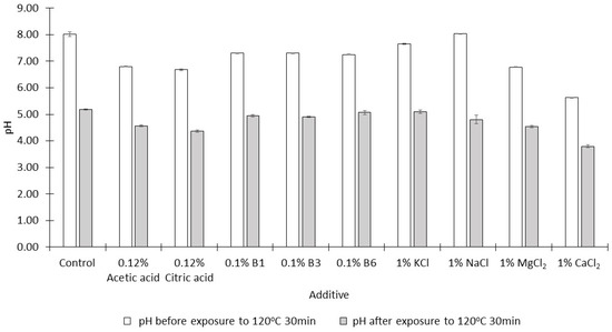 - Mestdagh, F.; Maertens, J.; Cucu, T.; Delporte, K.; Van Peteghem, C.; De Meulenaer, B. Impact of additives to lower the formation of acrylamide in a potato model system through pH reduction and other mechanisms. Food Chem. 2008, 107, 26–31. [Google Scholar] [CrossRef]