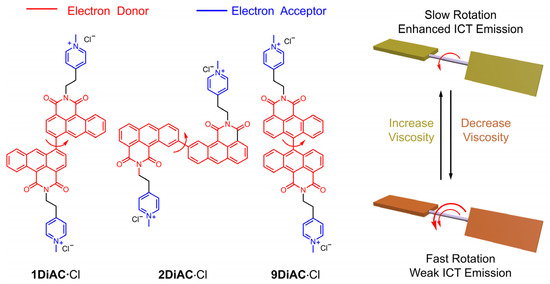 The following supporting information can be downloaded at: https://www.mdpi.com/article/10.3390/molecules28073217/s1, Scheme S1: The synthetic routes of the 1DiAC∙Cl; Scheme S2: The synthetic routes of the 2DiAC∙Cl; Scheme S3: The synthetic routes of the 9DiAC∙Cl; Figure S1: Absorption spectra of (a) 1DiAC∙Cl, (b) 2DiAC∙Cl, and (c) 9DiAC∙Cl in various solvents (c = 1 × 10−5 M). (d) Photographs of 1 mM 1DiAC∙Cl, 2DiAC∙Cl, and 9DiAC∙Cl in N, N-dimethylacetamide (DMA), N, N-dimethylformamide (DMF), 1-propanol (1-PrOH), ethanol (EtOH), dimethyl sulfoxide (DMSO), methanol (CH3OH), and water (H2O); Figure S2. Normalized emission spectra of (a) 1DiAC∙Cl, (b) 2DiAC∙Cl, and (c) 9DiAC∙Cl in various solvents (c = 1 × 10−5 M); Figure S3. (a) Absorption and (b) emission spectra of 2AC in N, N-dimethylacetamide (DMA), N, N-dimethylformamide (DMF), 1-propanol (1-PrOH), ethanol (EtOH), dimethyl sulfoxide (DMSO), methanol (CH3OH), and water (H2O). c = 1 × 10−5 M; Table S1. Photophysical Data for the Excitation Center λAbs, Emission Center λEm, Stokes Shift (ΔνSt), the Absolute Quantum Yield (ΦF), Fluorescent Lifetime (τ), and Molar Absorptivity (εmax) of 1DiAC·Cl, 2DiAC·Cl, and 9DiAC·Cl in Different Solvents; Table S2. Photophysical Data for the Excitation Center λAbs, Emission Center λEm, Stokes Shift (ΔνSt), and Molar Absorptivity (εmax) of 2AC in Different Solvents; Table S3. Dielectric constant (Ɛ), Refractive Index of the Solvent (n), and Orientation Polarizability (Δf) of solvents; Figure S4: Lippert–Mataga plots for (a) 1DiAC∙Cl, (b) 2DiAC∙Cl, and (c) 9DiAC∙Cl; Table S4: The Physical Parameters of the Solvents (Kamlet–Taft and Catalán); Table S5: Estimated Coefficients (y0, aα, bβ, cπ*), their Standard Errors, and Regression Coefficients (R2) for the Multilinear Analysis of νAbs, νEm, ΔνSt, and ΦF of Investigated Rotors in N, N-dimethylacetamide (DMA), N, N-dimethylformamide (DMF), 1-propanol (1-PrOH), ethanol (EtOH), dimethyl sulfoxide (DMSO), methanol (CH3OH), and water (H2O) as a Function of Kamlet–Taft Solvent Scales; Table S6: Estimated Coefficients (y0, aSA, bSB, cSP, dSDP), their Standard Errors, and Regression Coefficients (R2) for the Multilinear Analysis of νAbs, νEm, ΔνSt, and ΦF of Investigated Rotors in N, N-dimethylacetamide (DMA), N, N-dimethylformamide (DMF), 1-propanol (1-PrOH), ethanol (EtOH), dimethyl sulfoxide (DMSO), methanol (CH3OH), and water (H2O) as a Function of Catalán Solvent Scales; Table S7: Percentage Contribution of the Solvatochromic Parameters (Catalán Equation) Using Absorption, Emission Frequencies, and Absolute Fluorescent Quantum Yield; Figure S5: Absorption spectra of (a) 1DiAC∙Cl, (b) 2DiAC∙Cl, and (c) 9DiAC∙Cl binary mixtures of water and glycerol in different ratios. c = 1 × 10−5 M; Figure S6: Emission spectra of 1DiAC·Cl in binary mixtures of water and glycerol in different ratios. c = 1 × 10−5 M; Table S8: Viscosity in Different Fractions of Glycerol in Water at 25 °C; Figure S7: Emission spectra of (a) 1DiAC·Cl, (b) 2DiAC·Cl, and (c) 9DiAC·Cl in binary mixtures of water and glycerol (v:v = 2:8, c = 1 × 10−5 M) at 25 and 80 °C; Figure S8: Emission spectra of (a) 1DiAC·Cl, (b) 2DiAC·Cl, and (c) 9DiAC·Cl in DMF (c = 1 × 10−5 M) at 20 and 60 °C; Figure S9: Mixed space filling and stick representations of the X-ray crystal structures of 9DiAC·PF6 as viewed from the front and the side. Hydrogen atoms and counterions have been omitted for clarity; Table S9: Crystallographic Parameters for 9DiAC·PF6; Figure S10: 1H NMR spectrum of 1An Dione (400 MHz, DMSO-d6, 298 K); Figure S11: 1H-1H COSY NMR spectrum of 1An Dione (400 MHz, DMSO-d6, 298 K); Figure S12: 13C NMR Spectrum of 1An Dione (101 MHz, DMSO-d6, 298 K); Figure S13: 1H NMR spectrum of 1An Anhydride (400 MHz, DMSO-d6, 298 K); Figure S14: 13C NMR spectrum of 1An Anhydride (101 MHz, DMSO-d6, 298 K); Figure S15: 1H NMR spectrum of 1AC (400 MHz, CDCl3, 298 K); Figure S16: 13C NMR spectrum of 1AC (101 MHz, CDCl3, 298 K); Figure S17: 1H NMR spectrum of 1DiAC (400 MHz, DMSO-d6, 298 K); Figure S18: 13C NMR spectrum of 1DiAC (101 MHz, DMSO-d6, 298 K); Figure S19: 1H NMR spectrum of 1DiAC∙PF6 (400 MHz, CD3CN, 298 K); Figure S20: 13C NMR spectrum of 1DiAC∙PF6 (101 MHz, CD3CN, 298 K); Figure S21: 1H NMR spectrum of 2An Dione (400 MHz, DMSO-d6, 298 K); Figure S22: 13C NMR spectrum of 2An Dione (101 MHz, DMSO-d6, 298 K); Figure S23: 1H NMR spectrum of 2AC (400 MHz, CDCl3, 298 K); Figure S24: 13C NMR spectrum of 2AC (101 MHz, CDCl3, 298 K); Figure S25: 1H NMR spectrum of 2DiAC∙PF6 (400 MHz, CD3CN, 298 K); Figure S26: 13C NMR spectrum of 2DiAC∙PF6 (101 MHz, CD3CN, 298 K); Figure S27: 1H NMR spectrum of 9DiAn Dione (400 MHz, CDCl3, 298 K); Figure S28: 13C NMR spectrum of 9DiAn Dione (101 MHz, CDCl3, 298 K); Figure S29: 1H NMR spectrum of 9DiAn Anhydride (400 MHz, CDCl3, 298 K); Figure S30: 13C NMR spectrum of 9DiAn Anhydride (101 MHz, CDCl3, 298 K); Figure S31: 1H NMR spectrum of 9DiAC (400 MHz, CDCl3, 298 K); Figure S32: 13C NMR spectrum of 9DiAC (101 MHz, CDCl3, 298 K); Figure S33: 1H NMR spectrum of 9DiAC∙PF6 (400 MHz, CD3CN, 298 K); Figure S34: 13C NMR spectrum of 9DiAC∙PF6 (101 MHz, CD3CN, 298 K); Figure S35: High resolution mass spectra of 1An Dione; Figure S36: High resolution mass spectra of 1An Anhydride; Figure S37: High resolution mass spectra of 1AC; Figure S38: High resolution mass spectra of 1DiAC; Figure S39: High resolution mass spectra of 1DiAC∙PF6; Figure S40: High resolution mass spectra of 2An Dione; Figure S41: High resolution mass spectra of 2AC; Figure S42: High resolution mass spectra of 2DiAC∙PF6; Figure S43: High resolution mass spectra of 9DiAn Dione; Figure S44: High resolution mass spectra of 9DiAn Anhydride; Figure S45: High resolution mass spectra of 9DiAC; Figure S46: High resolution mass spectra of 9DiAC∙PF6. References [38,39,40,41] are cited in the Supplementary Mat