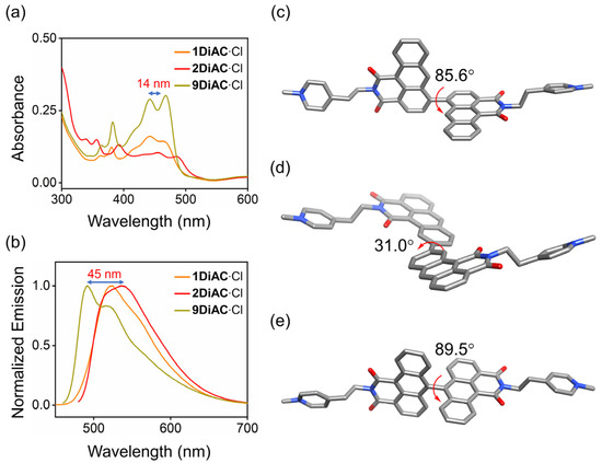 (a) Overlayed absorption and (b) normalized emission spectra of 1DiAC·Cl, 2DiAC·Cl, and 9DiAC·Cl in DMA. c = 1 × 10−5 M. Gas phase optimized geometries of (c) 1DiAC∙Cl, (d) 2DiAC∙Cl, and (e) 9DiAC∙Cl at a dielectric constant of εr = 1.00 and their corresponding dihedral angles between the fused anthracene carboxyimide moieties using the B3LYP functional with a 6–31G(d,p) basis set. Hydrogen atoms and counterions have been omitted for clarity.