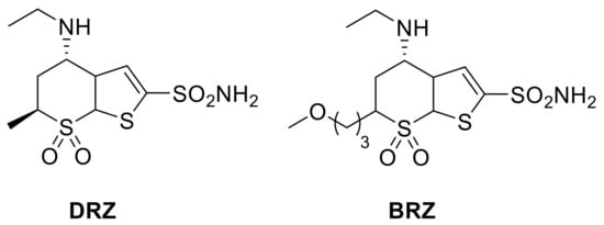 - Prugh, J.D.; Hartman, G.D.; Mallorga, P.J.; McKeever, B.M.; Michelson, S.R.; Murcko, M.A.; Schwam, H.; Smith, R.L.; Sondey, J.M.; Springer, J.P.; et al. New isomeric classes of topically active ocular hypotensive carbonic anhydrase inhibitors: 5-substituted thieno[2,3-b]thiophene-2-sulfonamides and 5-substituted thieno[3,2-b]thiophene-2-sulfonamides. J. Med. Chem. 1991, 34, 1805–1818. [Google Scholar] [CrossRef]