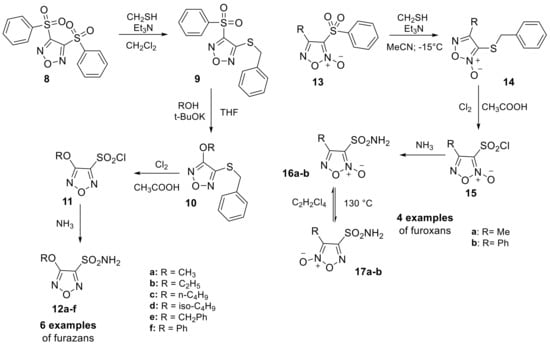 - Chegaev, K.; Rolando, B.; Guglielmo, S.; Fruttero, R.; Gasco, A. Unsymmetrically substituted furoxans. Part 19. Methyl and phenylfuroxansulfonic acids and related sulfonamides. J. Heterocycl. Chem. 2009, 46, 866–872. [Google Scholar] [CrossRef]
