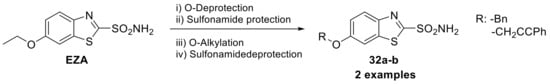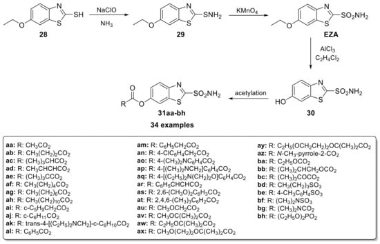 - Woltersdorf, O.W., Jr.; Schwam, H.; Bicking, J.B.; Brown, S.L.; deSolms, S.J.; Fishman, D.R.; Graham, S.L.; Gautheron, P.D.; Hoffman, J.M.; Larson, R.D.; et al. Topically active carbonic anhydrase inhibitors. 1. O-acyl derivatives of 6-hydroxybenzothiazole-2-sulfonamide. J. Med. Chem. 1989, 32, 2486–2492. [Google Scholar] [CrossRef]