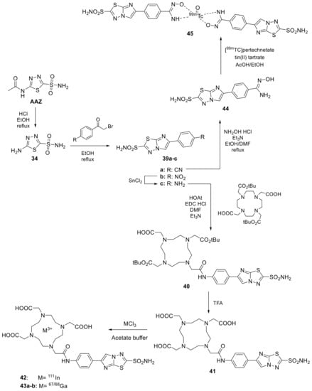 - Iikuni, S.; Kitano, A.; Watanabe, H.; Shimizu, Y.; Ono, M. Synthesis and evaluation of novel technetium-99m-hydroxamamide complex based on imidazothiadiazole sulfonamide targeting carbonic anhydrase-IX for tumor imaging. Bioorg. Med. Chem. Lett. 2020, 30, 127596. [Google Scholar] [CrossRef]