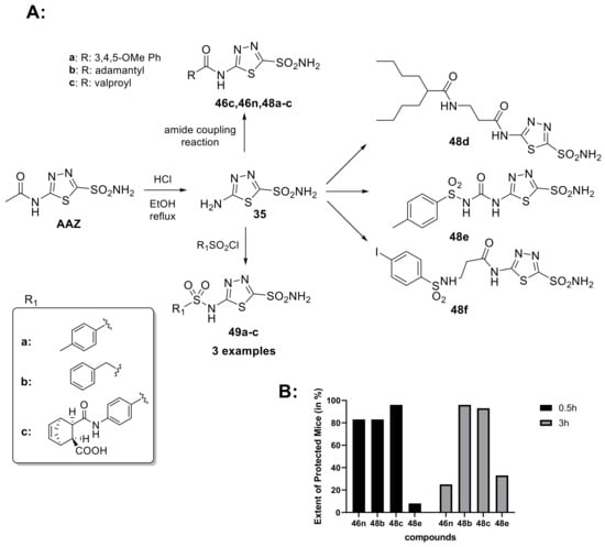 - Chufán, E.E.; Pedregosa, J.C.; Baldini, O.N.; Bruno-Blanch, L. Anticonvulsant activity of analogues of acetazolamide. Farmaco 1999, 54, 838–841. [Google Scholar] [CrossRef]