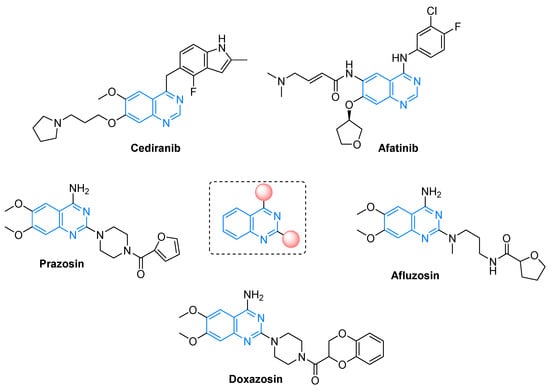 Nitrogen heterocycles are found in a large number of biologically active natural products as well as synthetic compounds [1,2]. Amongst them, quinazolines are an attractive class of heterocycles and serve as building blocks in making advanced intermediates and active pharmaceutical ingredients (APIs) for the pharmaceutical industry [3,4]. They have been found to possess a diverse range of pharmacological properties including anti-inflammatory [5], anticancer [6], anticonvulsant [7], anti-hypertensive [8], anti-HIV [9], anti-tubercular [10], antibacterial [11], antifungal [12], antiviral [13], antimalarial [14], anti-plasmodial [15], α-adrenergic blocker [16], antioxidant [17], and antitumor activities [18]. Additionally, quinazoline derivatives have been applied as photochemotherapeutic agents [19], JAK2, DNA-gyrase, PDE5, and EGFR tyrosine kinase inhibitors [20,21,22,23], and CB2 receptor agonists [24]. Quinazolines have been used in regimens for a wide range of physical ailments such as hematological cancer, liver metastasis (Cediranib), breast cancer (Afatinib), high blood sugar and hypertension (Prazosin), benign prostatic hyperplasia (Afluzosin), and prostate enlargement and high blood pressure (Doxazosin) [25,26,27,28]. These fused N-heterocyclic cores are present in lung cancer drugs and therapeutic agents for pneumonia and post-traumatic stress or anxiety disorders [29,30,31,32]. Some quinazoline-based drugs are illustrated in Figure 1.